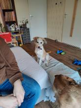 Kira is vol met vreugde voor het leven. Past zich relatief snel aan vergeleken met wat er eerder is gebeurd. Kan goed overweg met kinderen en andere dieren. Binnen is ze rustig en richt ze geen schade aan en het enige wat zeker is, is dat ze haar pootje niet mist want ze rent als een gazelle.